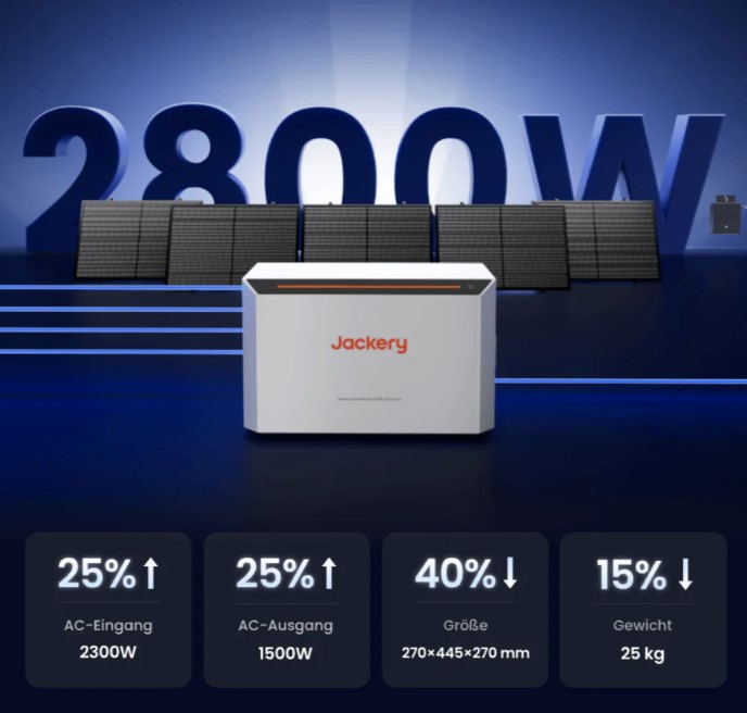 Das Jackery HomePower 2000 Ultra ist ein fortschrittliches Balkonkraftwerk, das eine maximale Solareingangsleistung von 2.800 W bietet. Es kombiniert 2.000 W Eingang durch Dual-MPPT (Maximum Power Point Tracking) und zusätzliche 800 W über einen Mikrowechselrichter. Diese Kombination ermöglicht eine optimale Energieausnutzung und hohe Effizienz.